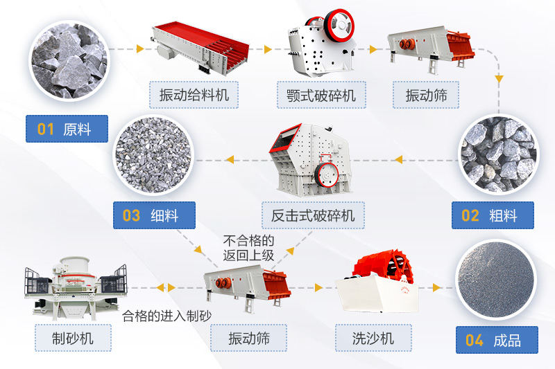 首先,大塊石料經(jīng)料倉由振動給料機均勻地送進顎式破碎機進行粗碎,粗碎后的石料由膠帶輸送機送到反擊式破碎機進行進一步破碎;細碎后的石料由膠帶輸送機送進振動篩進行篩分,篩分出幾種不同規(guī)格的石子,滿足粒度要求的石子由成品膠帶輸送機送往成品料堆;不滿足粒度要求的石子由膠帶輸送機返料送到反擊式破碎機進行再次破碎,形成閉路多次循環(huán)。成品粒度可按照用戶的需求進行組合和分級,為保護環(huán)境,可配備輔助的除塵設備。